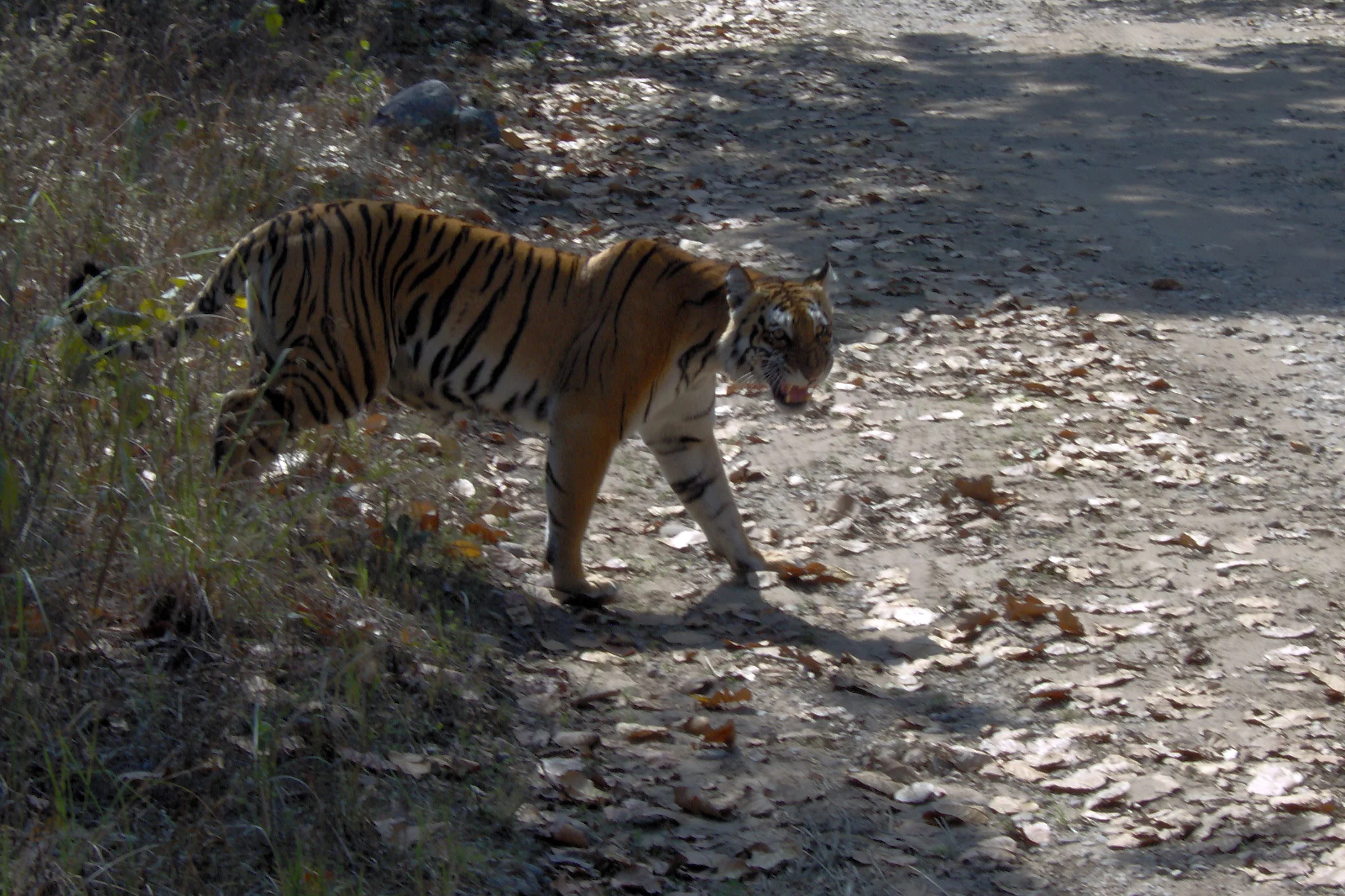Amazingly, as soon as she crossed the road she went about twenty feet and laid down in the shade. She is incredibly hard to see now. The stripes on a tiger are the same shape as shadows of limbs and branches of trees in the Indian forests. The fallen leaves are similar shades of orange to a tiger's base coat. To say she is perfectly camouflaged is an understatement.